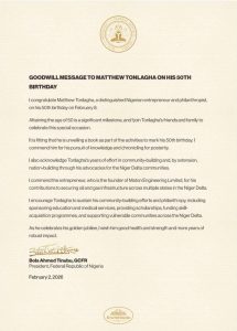 President Bola Ahmed Tinubu has congratulated Matthew Tonlagha, a renowned Nigerian entrepreneur and philanthropist, on his 50th birthday, praising his contributions to community-building and nation-building.