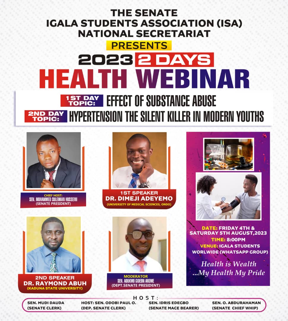 The Senate, Igala Students’ Association (ISA) , National Secretary has declared a 2-day online Health Webinar scheduled to hold on Friday, 4th of August and ends tomorrow Saturday, 5th of August, 2023.