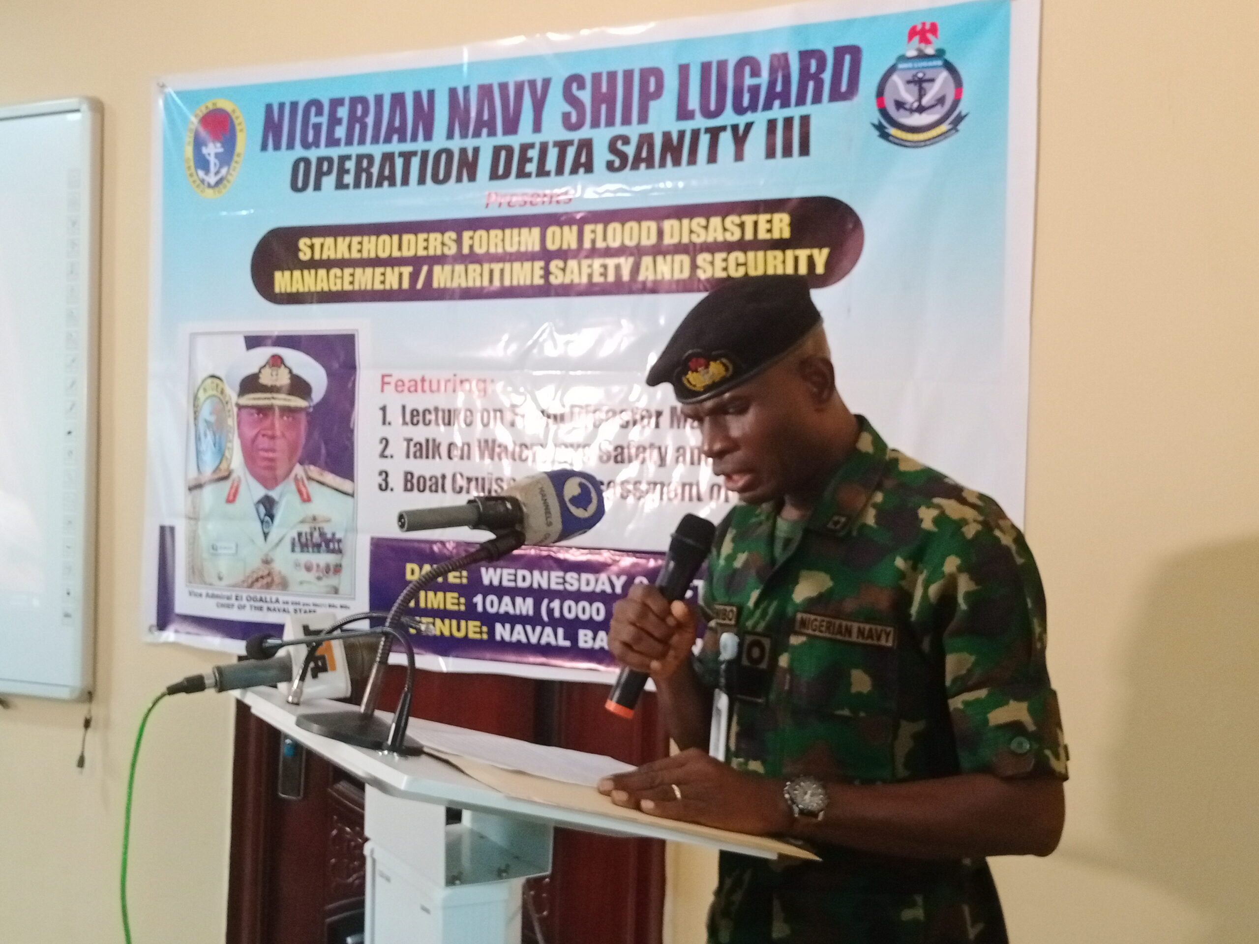 Commodore Senibo made the call during a stakeholders forum on flood disaster management / maritime safety and security organized by Nigerian Navy Ship Lugard under the auspices of Operation Delta Sanity III at Naval base Banda, Lokoja, Kogi state.